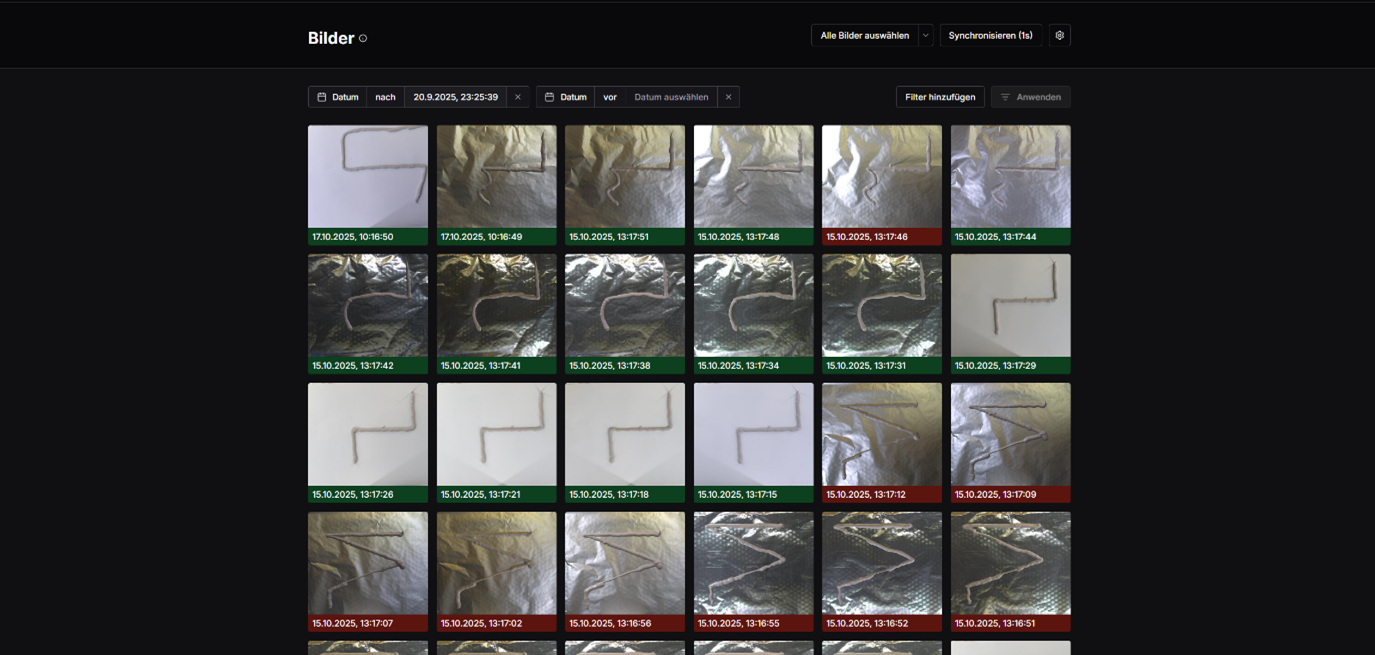 History analysis for quality and process. In addition to live feedback, there is a collective view with filter functions for all recordings. Quality and process engineers can see frequencies, time sequences, and sample images—the basis for root cause analysis and sustainable process improvements.